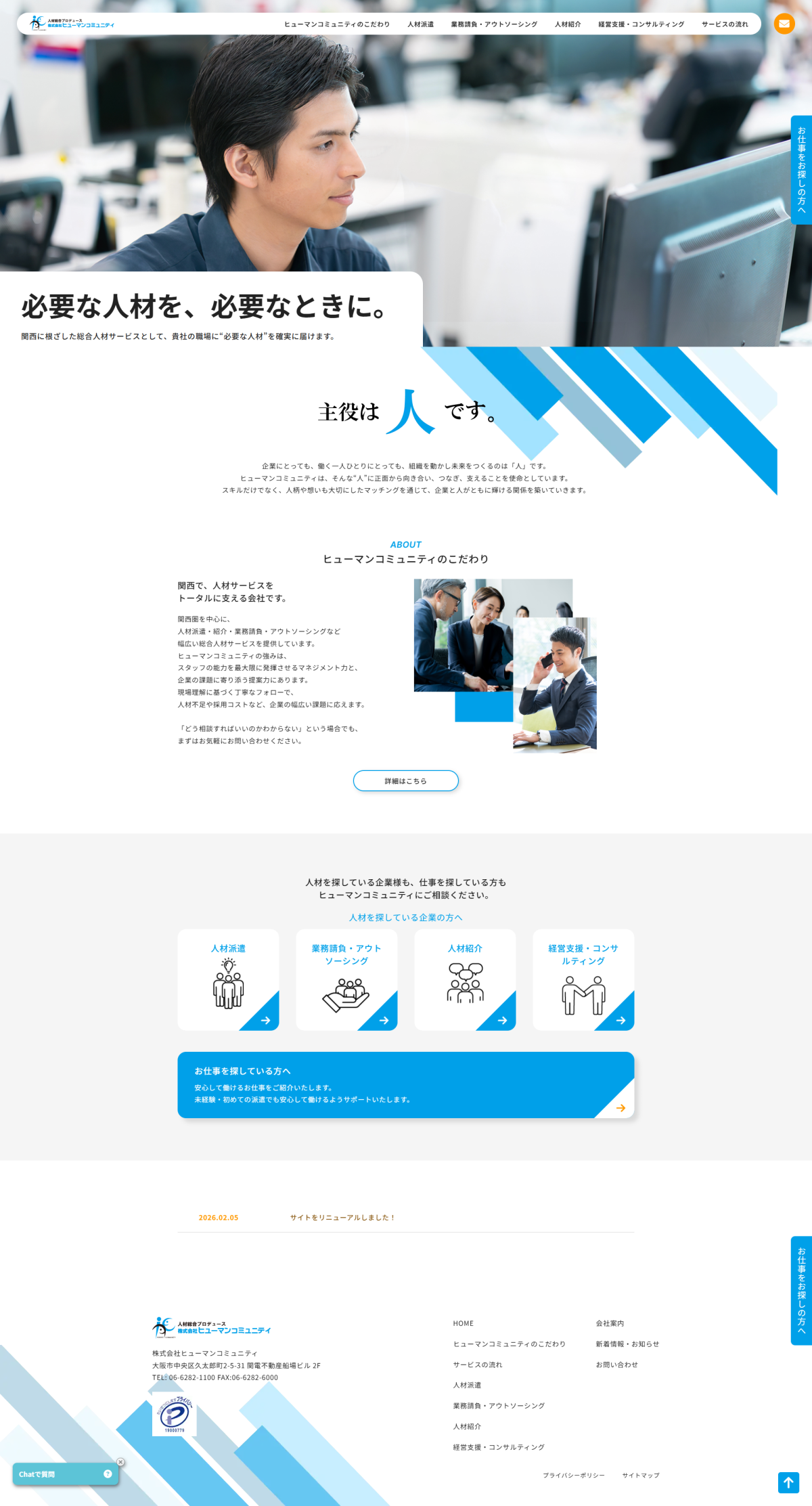 このたび、株式会社ヒューマンコミュニティの公式サイトをリニューアルいたしました。 今後も人材派遣、業務請負・アウトソーシング、人材紹介、経営支援を中心に「総合人材サービス」を関西圏を中心に提供して参ります。
